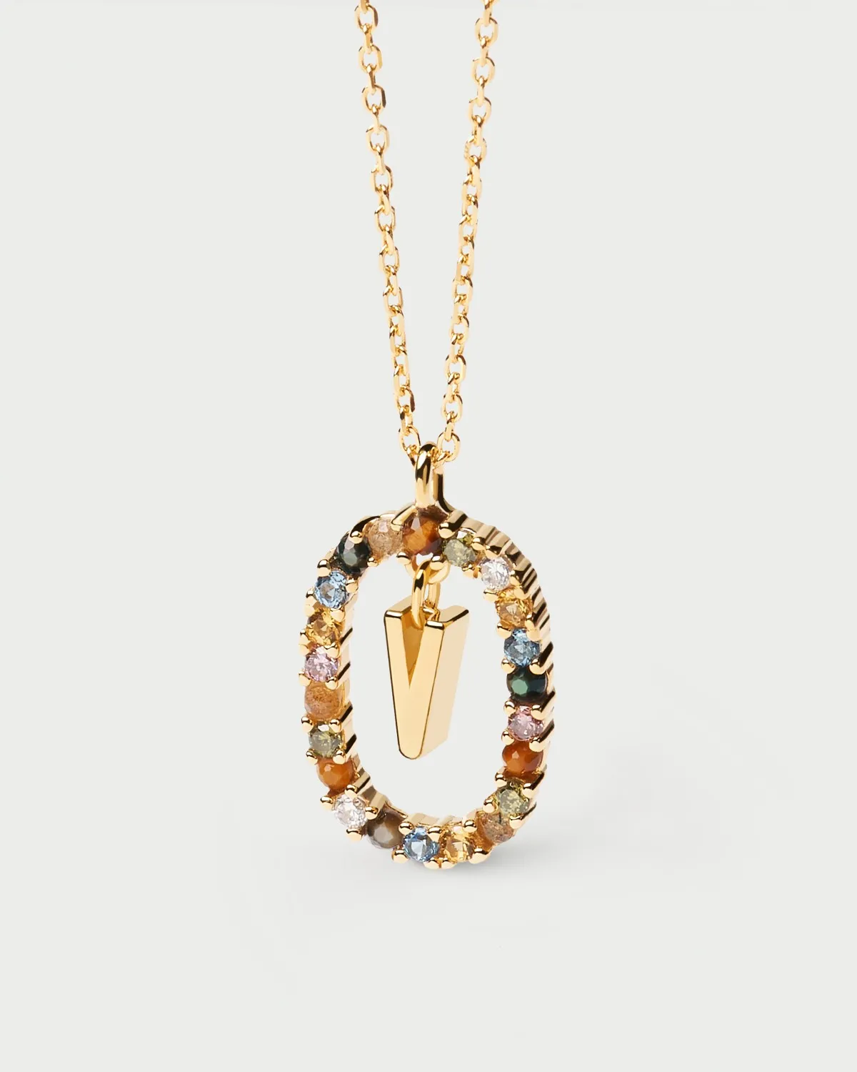 Colgante Inicial Letra V con piedras multicolor | CO01-281PLATA RECICLADAComo parte del compromiso PDPAOLA por utilizar materiales más responsables, está introduciendo la plata reciclada en la fabricación de muchas de las piezas. La plata reciclada que emplea procede de fuentes verificadas por organismos reconocidos. Material: Plata de Ley Acabado: Baño de Oro 18K PIEDRAS: Ojo de tigre Labradorita Nácar con cristal Cristal amarillo dorado Cristal verde peridoto Cristal verde oliva Cristal azul espinela Cristal violeta rodolita Cristal blanco puro Diámetro de las PIEDRAS: 1.5 mm Medidas del óvalo: 10.5×15 mm ALTURA FRONTAL de LA LETRA: 6.5 mm GROSOR de la letra: 3 mm Cadena: cierre ajustable de 40 a 50 cm Peso: 2.5 g